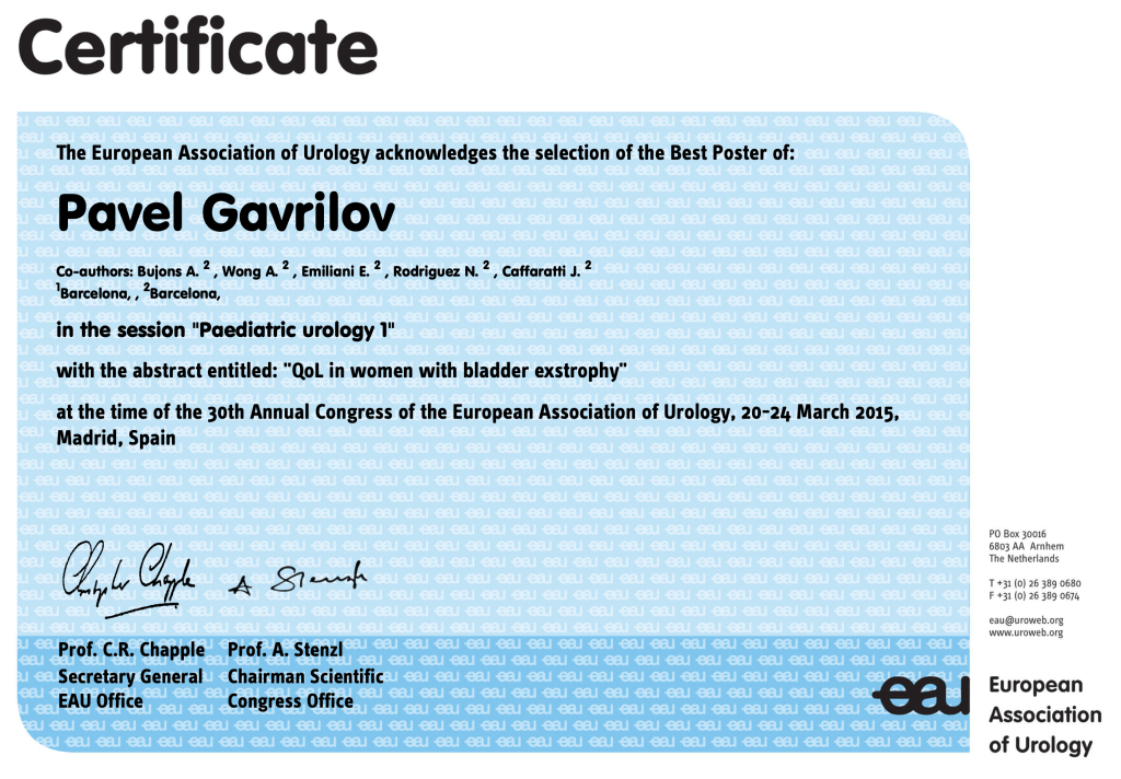He tenido la oportunidad de publicar artículos científicos, participar en congresos nacionales e internacionales y recibir reconocimientos, como el premio al mejor trabajo en urología pediátrica en el 30th European Congress of Urology (Madrid, 2015).